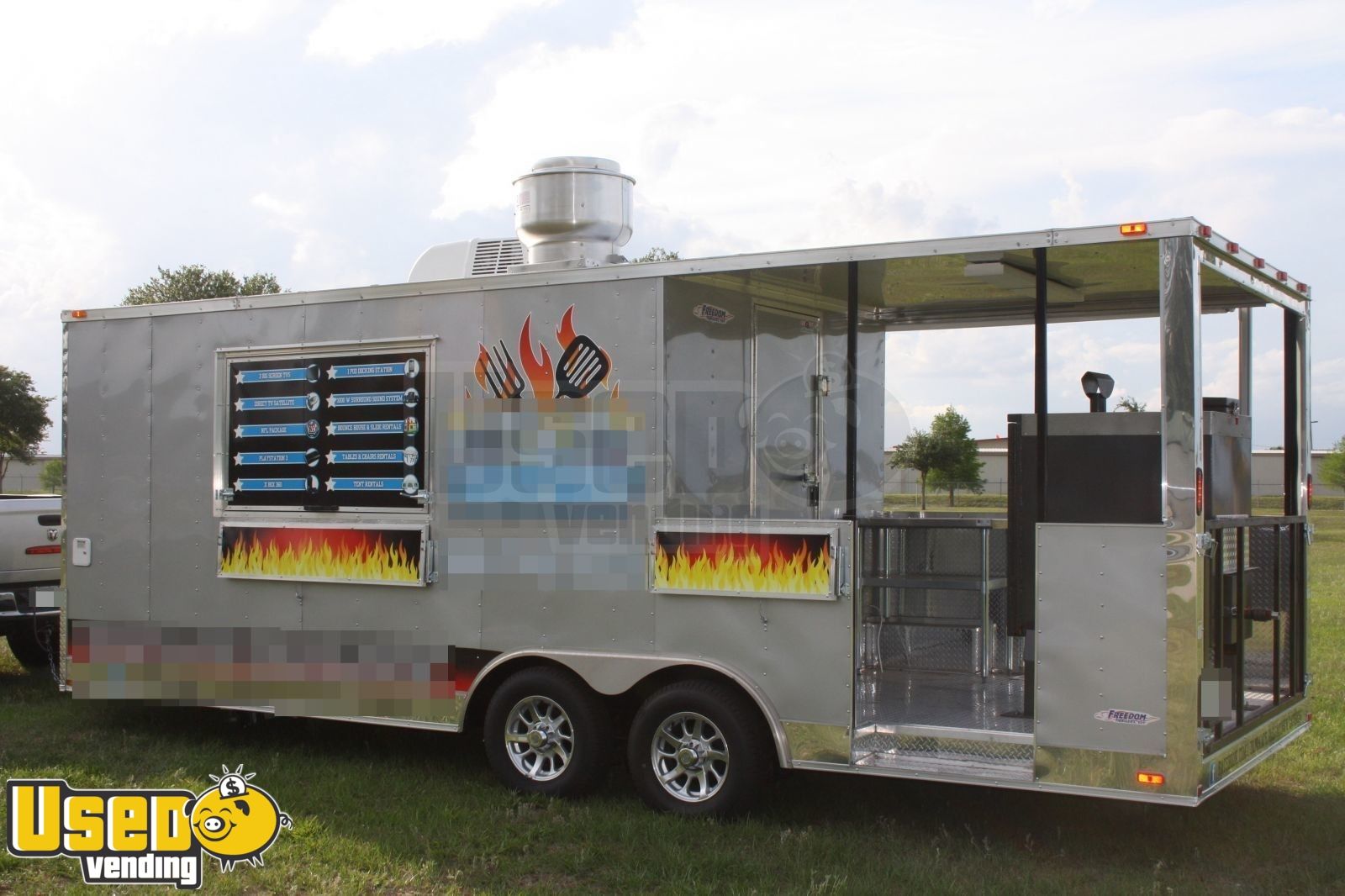 For sale in Florida - custom built full kitchen 2013 Freedom BBQ trailer with smoker porch. 24' x 8.5'. This trailer is equipped to sell BBQ also burgers, hot dogs, sausages, steak & cheese, turkey legs, fries, nachos, etc. This trailer is in like new condition. See details for more info.