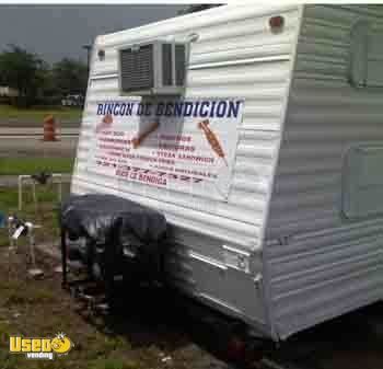 This is a 24' mobile home, converted into a fully equipped kitchen with such features as microwave, air conditioner, grill, food warmer; it also has a refrigerator, deer fryer, range, generator, and more. The trailer was manufactured in 1984 and was used as a concession trailer for just a few months.