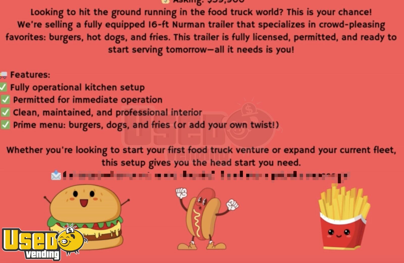 The POS system also requires a simple transition to the new owner. Additionally, this sale includes a prime parking spot, with payment responsibility transferring to you. A commissary is already in place, and you will just need to take over the payment arrangements. It comes with an established phone number that can be easily transferred.