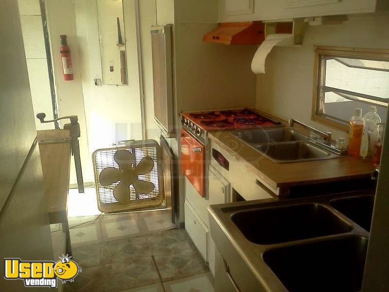 Cute vintage trailer is set up for selling tacos & burritos, salads, smoothies, biscuits & gravy, etc. Includes Full convection oven, 3 compartment sink, hand sink, bonus sink, bathroom, refrigerator, butcher block table with can opener, & microwave. In good condition.
