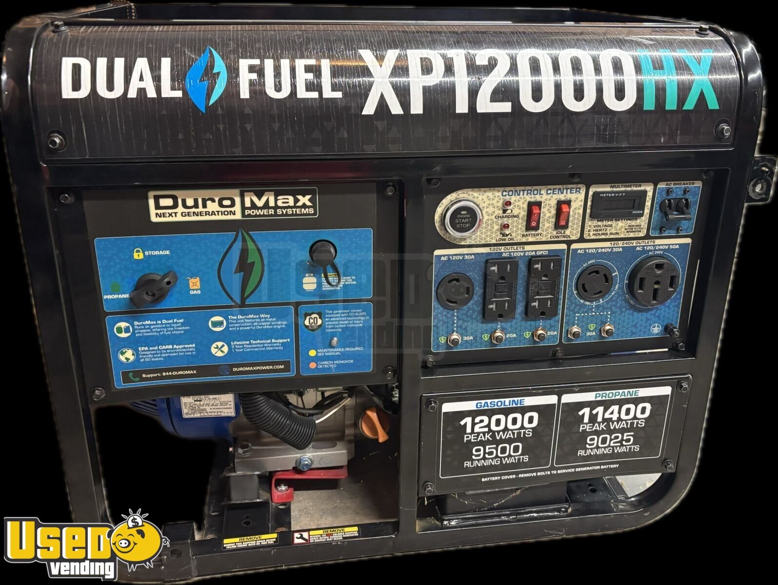 - DuroMax dual-fuel generator and two 25-gallon propane tanks