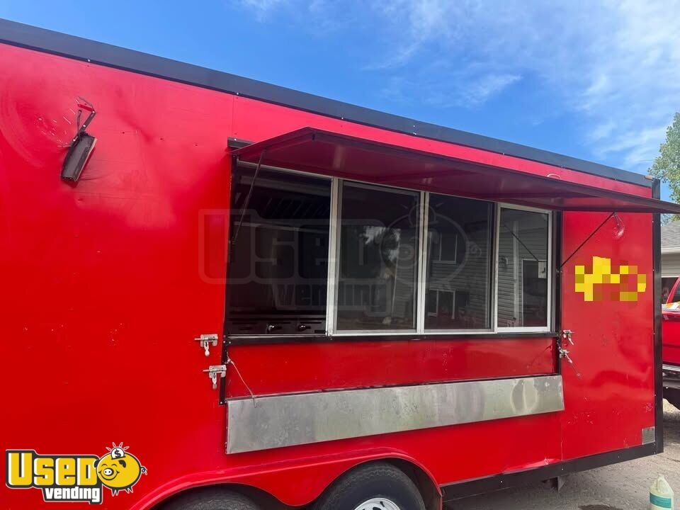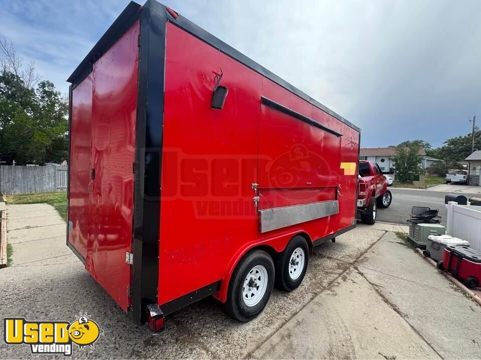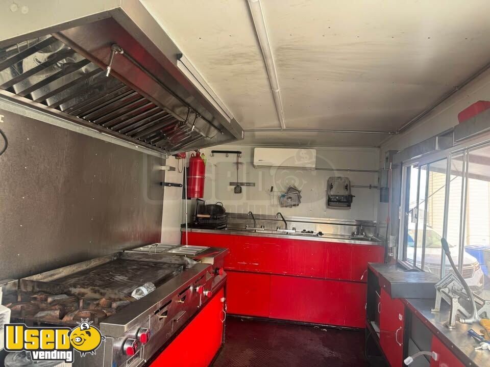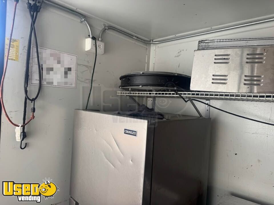 This food trailer is equipped and ready for operation, offering a reliable setup for mobile food service. Lightly used and in good condition, it includes essential appliances and storage, with sturdy tires and an A/C unit for comfort.