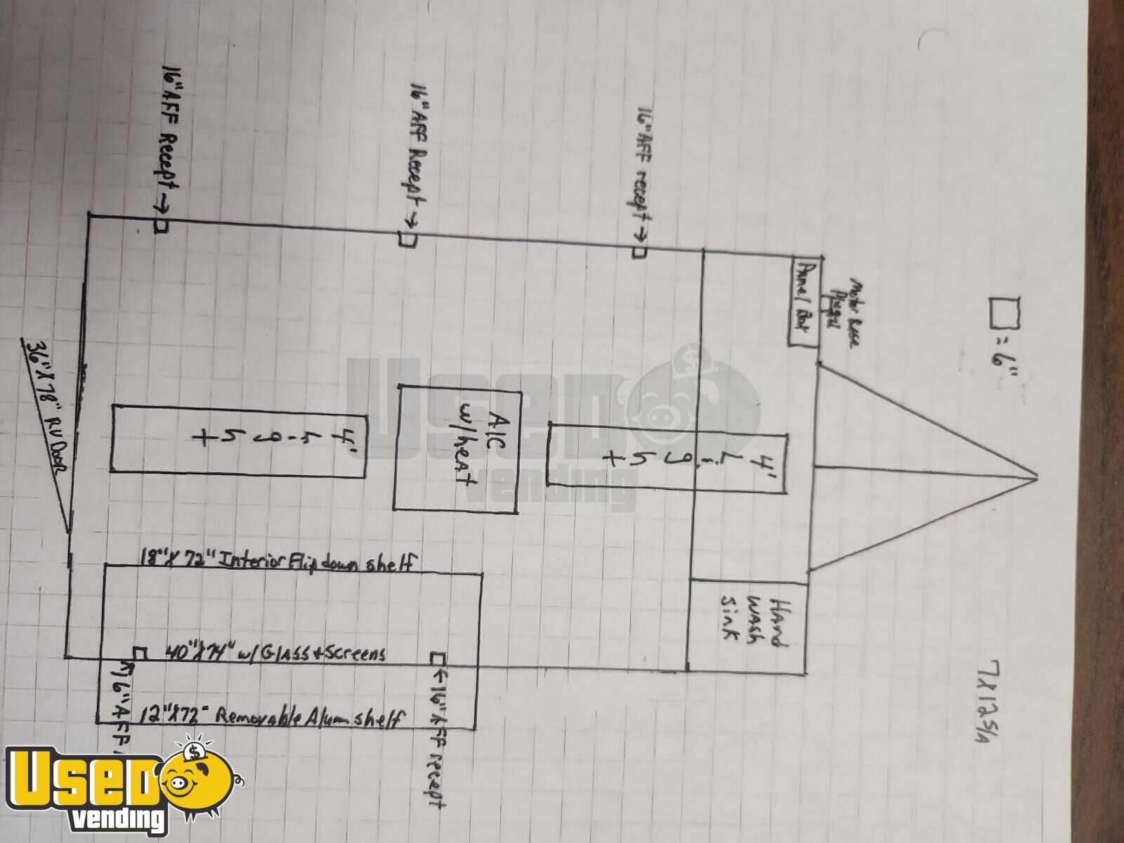 Please note, the images shown are for reference only; the final model will feature a rear-mounted service door. The unit will include a finished interior with installed sinks, lighting, heating and air conditioning, a concession window, insulated walls, durable flooring, a 50-amp electrical system, functional brakes, a 4,400 lb axle, and an extended tongue for improved maneuverability. The sketch is how the trailer will be laid out.